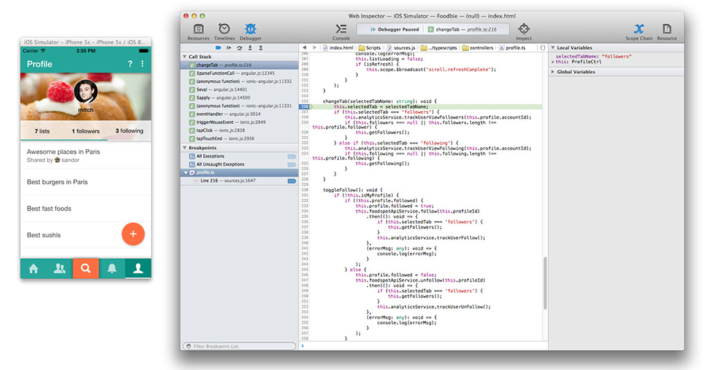 And exactly like Chrome Dev Tool, if you use Typescript or CoffeeScript, you can actually debug your app directly inside your Typescript or CoffeeScript files thanks to the JS source maps, as shown in the screen below.
