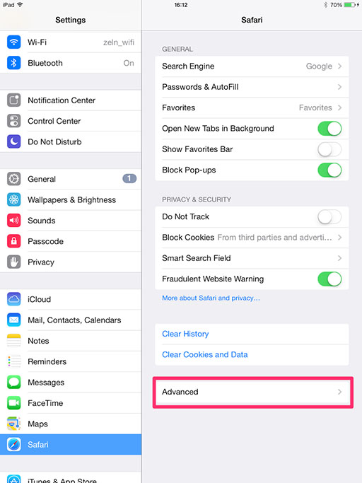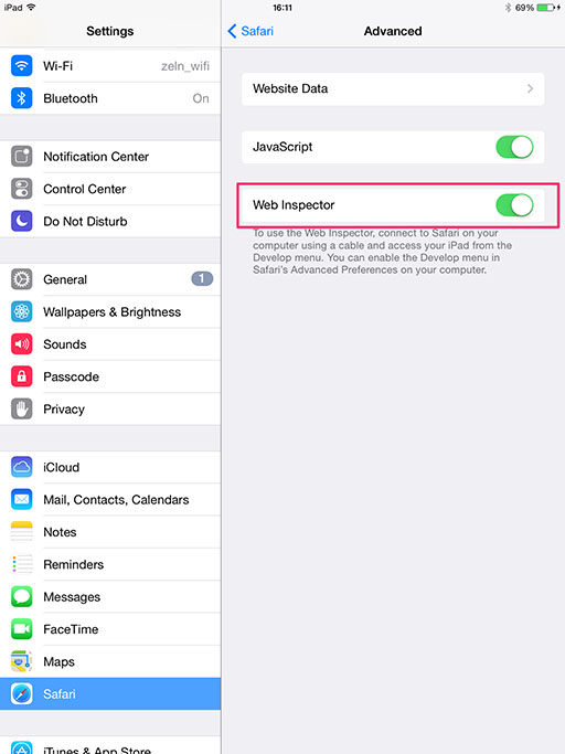 Now, you need to enable Web Inspector in the advanced Safari Settings of your iOS Device. Go toSettings>Safari>Advancedandenable Web Inspector.